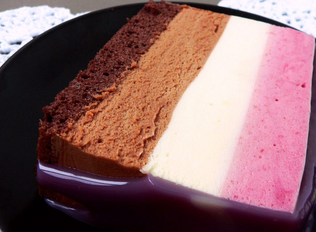 Compoziție: blat umed de ciocolata, mousse de vanilie, mousse de ciocolată